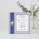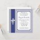 Um convite religioso elegante em fundo de bolinhas periwinkle com fronteira lateral e crucifixo de ornamentado decorado com borboletas. Os convites são fáceis de personalizar e são completos com envelopes e sua escolha de papel.