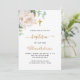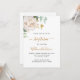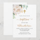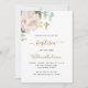 Um fundo branco decorado com folhagem de eucalipto, uma peônia branca e folhas douradas. Personalize com o nome da criança e detalhes da cerimônia. Letras pretas e douradas.