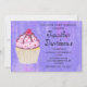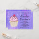 Um convite de festa de aniversário com uma ilustração de um cupcake delicioso. Cobertura rosa e gotas de chocolate. Um porta-cupcake amarelo e uma framboesa por cima. Delicioso! O fundo é uma textura roxa abstrata com corações pequenos espalhados por toda parte.