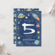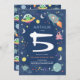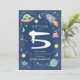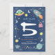Celebrate your little one’s 5th birthday with this fun space astronaut alien invitation! Featuring a navy background with playful monster aliens, stars, and rockets along the border, plus a matching alien pattern on the back. Easily personalize with your party details and edit age if necessary. The perfect galaxy-themed invitation for your space-loving birthday boy!