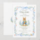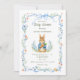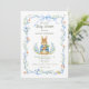 Celebrate the upcoming arrival of your little one with this classic storybook-inspired baby shower invitation. Featuring a charming, hand-painted watercolor bunny holding a carrot, this design is framed by delicate blue ribbons, whimsical bows, and soft garden florals.