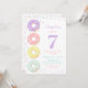Cute and sweet kids birthday party invitations featuring watercolor donuts and colorful sprinkle with number '7' in a large bold serif font. All text can be personalized.