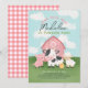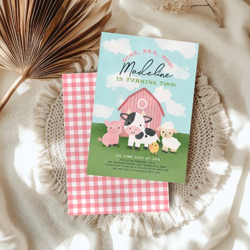 Celebrate your girls 2nd birthday with this cute farm animal barnyard invitation featuring a watercolor style pink barn, baby pig, cow, sheep, and chick. Fun and colorful, with “Oink, Baa, Moo – [Name] is turning two!” on the front and classic pink gingham on the back. Perfect for a toddler’s farm birthday party!