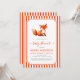 The text is in a red frame on a red stripes background. In the upper part of the frame, above all text, it has a cute red fox, painted in watercolor. Under it there is the text: the words "baby shower" and are written in a red handwriting script, the name and the date / time in red caps, the rest in smaller black caps. On the back, there are only res stripes.