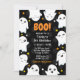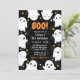 This fun and spooky birthday invitation features adorable ghosts with cute facial expressions, yellow and orange stars and a black polka dot background. The text combines bold and sans serif fonts for a stylish and modern look. This is perfect for Halloween.