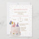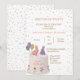 Celebrate a sweet milestone with this adorable illustrated invitation featuring two pastel bunnies perched on a birthday cake beside a golden number one, balloons, flowers, and colorful confetti. The soft, whimsical artwork makes it perfect for a cheerful first birthday celebration.