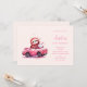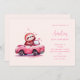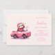 Birthday invitation with an adorable illustration. A happy looking sloth sitting in a sporty pink convertible. Waving as he drives by. With hearts floating upwards.