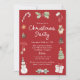 Invite friends and family to celebrate the season with this cute watercolor Christmas party invitation featuring hand-painted holiday illustrations. The festive border includes a candy cane, holly berries, red stocking, teddy bear, pinecone, Christmas tree, ornament, snowman, wrapped gift, and ribbons — all painted in a charming watercolor style. Set against a deep red background, “Christmas Party” appears in white handwritten script above your event details for a bright and festive contrast. A sweet and whimsical design perfect for family gatherings, children’s parties, or any cheerful holiday celebration.