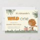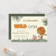 Um convite de aniversário selvagem com uma ilustração de um leão bonito com um presente. Ilustrada e projetada por Patricia Alvarez.