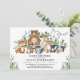 Celebrate the upcoming arrival of your little wild one with this whimsical woodland themed baby shower invitation. The design features a group of adorable forest friends (deer, bear, raccoon, fox, bunny, squirrel, skunk and owl) and rustic watercolor greenery.