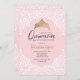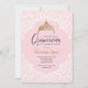 Um convite cor-de-rosa bonito do quinceañera com um branco, laço-como a folha de prova do teste padrão e uma coroa do ouro. (<a href='https://www.freepik.com/free-vector/quinceanera-party-invitation_3276553.htm'>Projetado por Freepik</a>). <br/><br/>O cartão é fácil de personalizar com seus fraseio, opções da pia batismal, do cor da pia batismal, as de papel da forma e escolha de seis tipos de papel<br/><br/>Não exatamente que você está procurando? Todos nossos produtos podem ser projetados para encontrar suas necessidades em nenhuma sobretaxa<br/><br/>Contacte-nos simplesmente em heartfelthelper@gmail.com. <br/><br/>Produtos de coordenação disponíveis: Apenas pergunte-nos!"