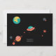 Um convite colorido que caracteriza uma nave espacial com uma janela, os planetas e as estrelas da foto em um fundo preto. Um convite delicioso para seu partido do espaço-tema.
