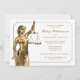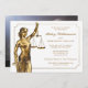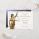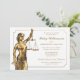 Convite da festa de formatura da escola de direito. Senhora Justiça com folha de ouro do falso. Elegante, elegante com fundo do quadro.