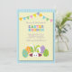 Um convite à refeição matinal da páscoa, nas cores pastel bonitas, caracterizando um coelho que sai de seu burrow com ovos da páscoa e as bandeiras coloridas contra um fundo listrado azul.