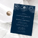 Convites de casamento florais elegantes, com uma borda de flores brancas delicadas e de fundo marinho. Personalize os convites florais de marinho com seus nomes e detalhes de casamento em letras brancas com sotaques de escrita de caligrafia. Projetado para coordenar com a nossa coleção de casamento de Dainess Floral.