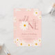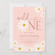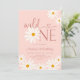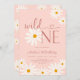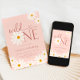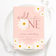 Daisy floral selvagem um convite de festas primeiro aniversario. Design de tendências bonitas em cor-de-rosa pincelado. Possui flores silvestres e fontes cardíacas. Você pode escolher convites impressos e/ou fazer o download instantâneo do modelo digital. Perfeito para uma festa de na moda boho nas primeiras raparigas.