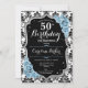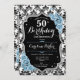 Elegante convite floral feminino de 50 anos com sua foto no final do cartão. Design azul poeirento branco preto brilhante com prata brilhante. Apresenta cor damasco preta e branca, rosas azuis claros, fonte de script e confetti. Perfeito para uma festa de comemoração de na moda adulto. Personalize com seus próprios detalhes. Pode ser personalizado para qualquer idade! Impressos convites Zazzle ou modelo de impressão digital instantânea para download.