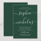This engagement party invitation features a deep woodland green background paired with flowing script names and clean, minimal text. The layout keeps everything easy to read while still feeling personal, with the script adding character without overwhelming the design. The contrast between handwritten style names and simple typography creates a balanced, modern look. Works well for engagement parties and other pre-wedding gatherings, especially for events with a slightly more formal or evening atmosphere. Pairs naturally with modern elegant, classic, minimalist, and woodland inspired wedding styles, as well as celebrations with darker or richer color palettes. A good choice if you want something clean, slightly refined, and not overly decorative, while still feeling intentional and styled. Available as printed cards or digital download.