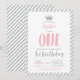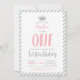 Celebre um dia especial com este convite moderno de primeiro aniversário em ouro e rosa! Este design apresenta um gráfico de coroa fofo e tipografia com brilho prateado.