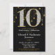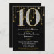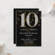 Um convite de festa de 10º aniversário elegante em preto e dourado, apresentando um grande 10 com diamantes e aparência dourada, juntamente com uma cortina cintilante de luzes douradas.