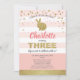 Convite de festa temática de coelho fofo rosa e dourado para 3º aniversário da menina.