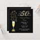 Convite de festa de aniversário de casamento de cinquenta anos chique, feito em preto e dourado. Gráficos de um copo de champanhe festivo decorado com um laço em tom dourado, no caule, e faíscas saindo do topo, decora o lado esquerdo do convite preto. O texto em branco e tom dourado é totalmente personalizável para atender às necessidades do seu evento.