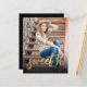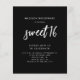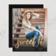 Moderno e doce convite de aniversário com 16 fotos verticais personalizadas. As palavras "doce 16" aparecem na folha de alumínio dourada na frente. Adicione os detalhes da parte traseira em texto branco em um plano de fundo preto. Substitua facilmente a imagem de exemplo por sua própria foto favorita do convidado de honra. Uma tela de gradiente preto ajuda a garantir que o texto seja pop.