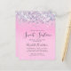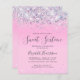 Convite de aniversário 16 bonito, glamouroso e giro, amigável em orçamento, com um confete brilhante, holográfico, roxo, rosa e prateado, contra fundo cor-de-rosa e "Doce Dezesseis" e seu nome em um roteiro de tendências de cinza mole.