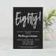 Um convite de aniversário elegante, simples, mas impressionante, preto e 80 prateado. Texto do script Glam na parte superior e texto prateado abaixo com o nome em branco sobressalente