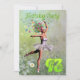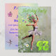 Uma bela fada de flores de bailarina dançando em um convite de aniversário. A bailarina está vestindo um tutu branco, e tem rastros de flores vindas de seu cabelo. Ela está dançando através de um cheio de margaridas.