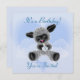 Convite de aniversário para crianças - Um cordeirinho bonito segurando um medalhão com a idade da criança que é mutável - um carneirinho está sentado em nuvens bonitinhas com um coração muito macio no céu.