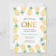 Tome uma primeira festa de aniversário tropical para a sua pequenina! Este adorável convite de aniversário inclui ananás com aquarela e ouro falso, que é moderno e tendencial. O fundo apresenta um padrão de triângulo amarelo. Todos os detalhes, incluindo (exceto idade), são personalizáveis. © Mini Moi Impressões