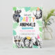 Um convite divertido e moderno! Apresenta cores vibrantes, animais da selva ou do zoológico, usando chapéus de festa e óculos de sol. Personalize o texto editável e use o convite para o seu evento cheio de Animais!
