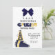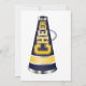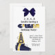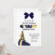 convite de festas de aniversário bonito para a menina que gosta de claque. Ele apresenta um megafone azul e amarelo no canto inferior esquerdo. Um gráfico de um arco azul pende do topo. Você personaliza o texto.