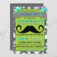 Convite de Aniversário Bigode Bash Chevron. Sua festa será a sensação quando todos levarem seus bigodes para a festa de aniversário. Este convite de aniversário para menino apresenta um fundo cinza neutro com estrelas abundantes e uma sobreposição de chevron verde que contém todo o texto da festa. Uma faixa cinza no topo diz "Festa de Aniversário", apenas no caso de alguém estar se perguntando. O texto serifado azul, preto e branco é disposto em um layout de estilo de pôster muito moderno e elegante e um bigode enorme se destaca também neste convite. Um convite muito "hipster" para qualquer festa de aniversário, seja você adulto ou criança!