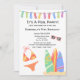 Festa de piscina para a adolescente ou adolescente, convite perfeito com um biquíni impresso laranja. Há uma série de chinelos coloridos pendurados no topo e um conjunto de conselhos surfs na areia. Personalize com suas informações de partido.