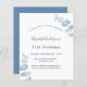 Um fundo branco, decorado com ramos e raminhos de eucalipto azul poeirento. Personalize e adicione um nome e detalhes da festa.