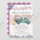 Convite de Aniversário Caminhão Antigo Roxo e Azul com Menina Camponesa Aquarela, Floral de Outono e Abóbora.
