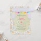 Um convite de aniversário infantil fofo com a metade superior decorada com um fundo roxo lavanda e uma faixa colorida, A parte do meio tem uma faixa verde pastel e a metade inferior deste convite encantador tem um padrão ilustrado com raposas adoráveis, passarinhos fofos e árvores verdes caprichosas. O centro tem uma moldura bege que contém todos os detalhes da sua festa.