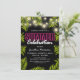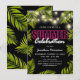 Convites de festa de aniversário de verão com um fundo preto elegante que pode ser alterado para qualquer cor, luzes de corda cintilantes, folhas de palmeira tropicais de verão, um letreiro neon rosa e branco, e um modelo de festa moderno que pode ser facilmente personalizado.