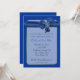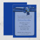 Elegante convite de aniversário de casamento feito em azul. Uma área de texto semitransparente em camadas é delimitada por uma borda em tom dourado, com gráficos de uma linda fita de cetim azul no topo, com uma jóia de safira azul emoldurada a ouro. Personalize todo o texto para atender às necessidades da sua festa. Um convite muito elegante e formal.