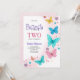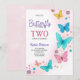 Convite de aniversário colorido com tema de borboleta. O texto diz "Aniversário da Borboleta, Dois" para Sophia Robinson. Borboletas e flores pastéis criam um tom alegre e caprichoso.