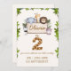 Celebre o dia especial do seu filho com este adorável convite de aniversário com animais da selva! Com ilustrações fofas de leão, elefante, girafa, zebra e hipopótamo cercados por folhas verdes da selva, este design simples, mas encantador, é perfeito para festas de aniversário infantis, eventos temáticos de safári ou chás de bebê.