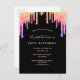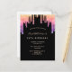 Um convite de festa de aniversário feminino e delicado para os 50 anos (ou qualquer idade). Na frente: Um fundo preto chique. Decorado com respingos de brilho falso, efeito de tinta pingando em roxo, rosa e dourado falso e rosa dourado. Personalize e adicione um nome e detalhes da festa. O nome é escrito com letras em estilo manuscrito, em cor rosa dourado claro.