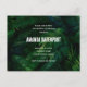 Cartão postal de convite de aniversário com um padrão apresentando grandes folhas verdes encontradas em uma floresta tropical.