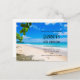 Convite de aniversário com uma fotografia adorável. Uma praia de areia branca com água azul-azulada. Imagem relaxante com um céu ensolarado e ondas suaves e espumosas com algumas folhas tropicais fofas enquadrando a imagem.