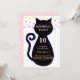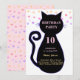 Silhueta de gato fofo e confetes multicoloridos em um fundo branco e rosa, convite de aniversário. Todos os textos e números estão prontos para serem personalizados.
