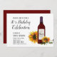 convite de aniversário com girassóis e garrafa de vinho