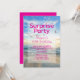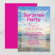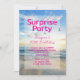 Modelo de convite para festa de aniversário com nascer do sol na praia. O texto brilhante magenta rosa faz parte deste design em camadas. O sol está nascendo sobre o oceano enquanto gaivotas voam acima. Esta é a imagem de fundo para o seu texto a ser colocado em três modelos. As primeiras linhas estão em impressão em negrito e embora a amostra seja para uma "festa surpresa", o convite funciona para muitos eventos. O segundo modelo é para o nome do homenageado com todas as informações da festa no parágrafo inferior. O verso também é rosa fúcsia.