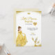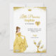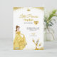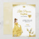 Convite de aniversário com uma princesa em um vestido amarelo e um candelabro. O texto diz, "A pequena princesa Sofia está fazendo cinco anos," com detalhes elegantes em dourado.